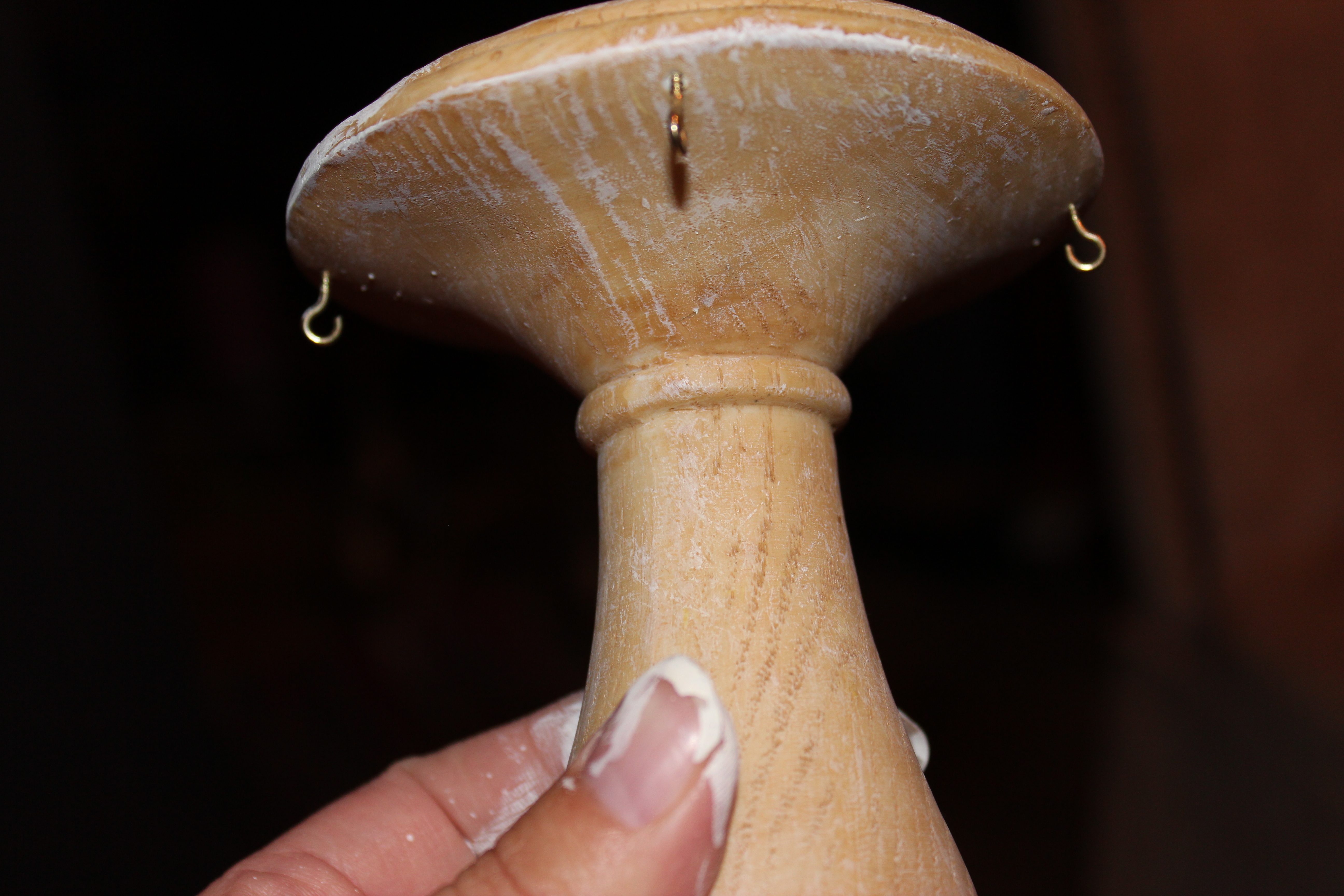 This is one of those pieces that I picked up where there isn’t anything particularly wrong with this pillar, but I thought it could look a little bit better. Please excuse the painted fingers. Now you know I do my own painting? and I again started painting and then remembered to take photos. I can’t help it I get excited to start a new project. I love all the little details at the bottom so I bought it with the intention of pulling the hooks out and filling them with putty.
