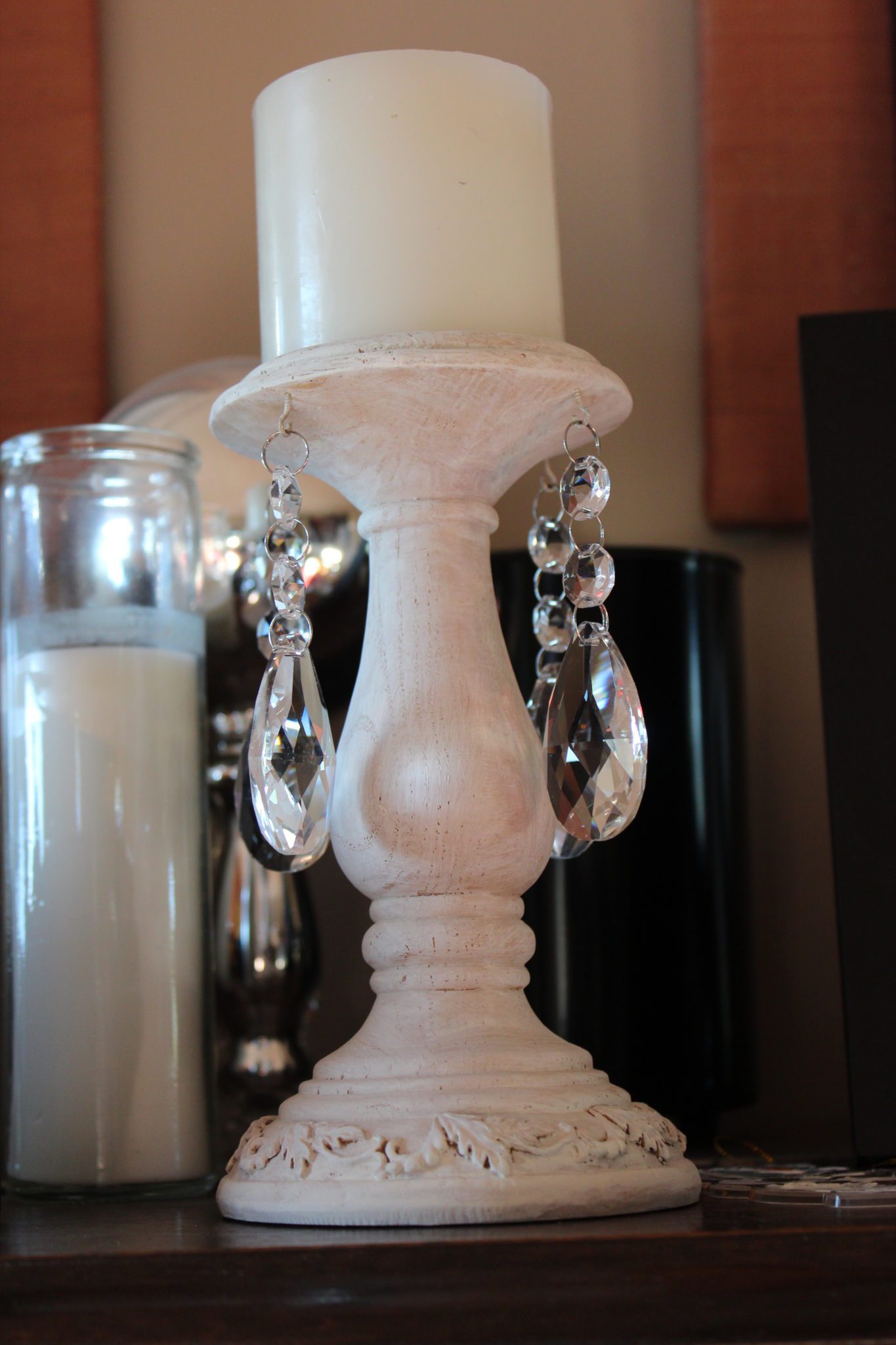I still gave the finish a white pickled look, which was part of my original farmhouse vision, by dry brushing in Junk Gypsy Buttermilk Biscuit paint. Then I hung crystals from it for a more glam look.